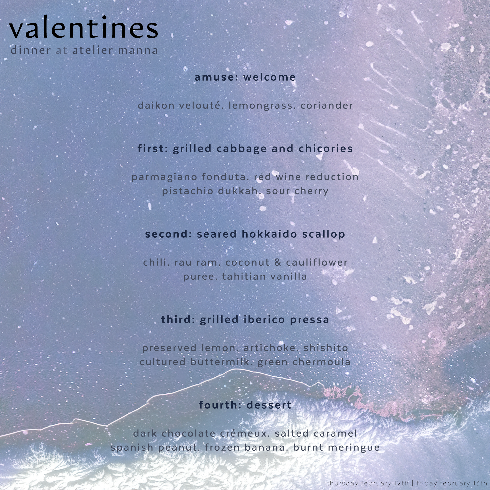 our michelin-recognized team at atelier manna makes their long awaited return to the dinner table with a limited run of evening services in celebration of your valentine… thursday february 12th and friday february 13th.